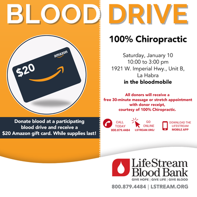 100% Chiropractic is hosting a community blood drive and networking event in partnership with LifeStream Blood Bank. Vendors will be on site, with plenty of time for networking, conversation, and sharing ideas with fellow community members.